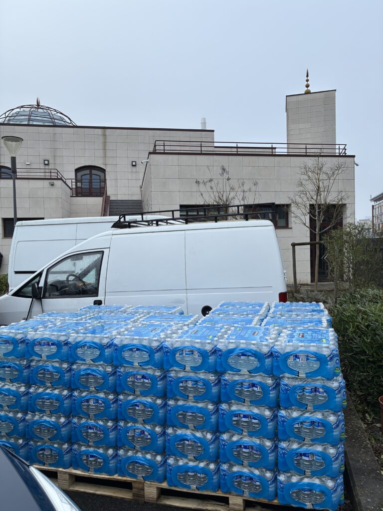 Troisième étape – Après un deuxième chargement chez le fournisseur, c’est à la mosquée de Vitry-sur-Seine qu’eu lieu la deuxième livraison, là où les frères nous ont aidés pour le déchargement.